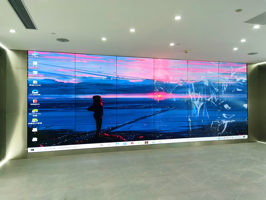 此項目由4×6的55寸1.7mm拼接屏在廣州天河區(qū)某公司展廳投入使用,顯示效果超過客戶預(yù)期。該用戶在CBD甲級寫字樓辦公,采用24塊1.7mm拼縫的拼接屏。